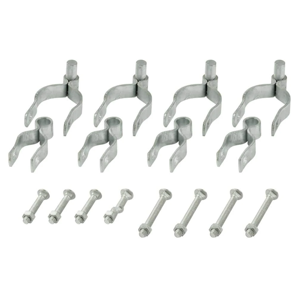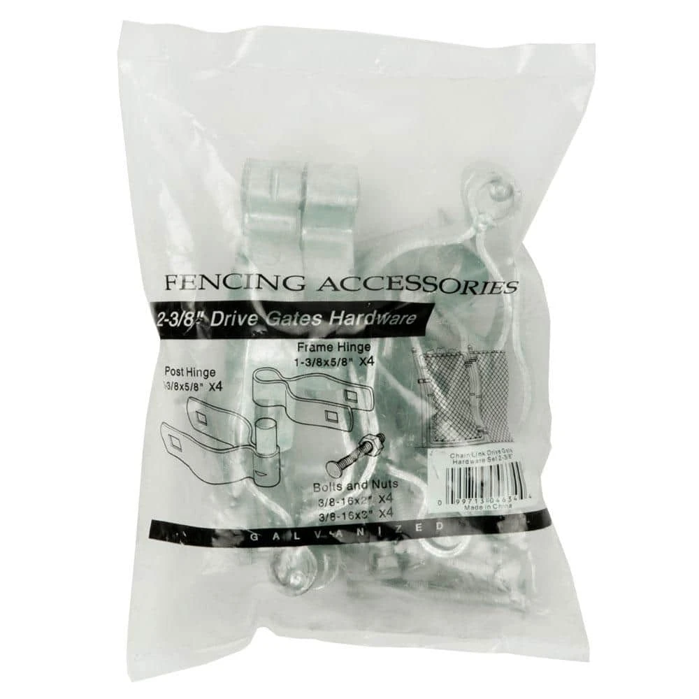 When installing or repairing a chain link fence gate, high quality Everbilt fence parts provide long-lasting stability to your project. The Everbilt Galvanized Steel Chain Link Drive Gate Hardware Set is a critical part of installing a reliable and secure drive-through gate. The set includes (4) metal post hinges, (4) metal gate frame hinges, and (8) metal carriage bolts/nuts. The metal gate hinges attach to gate frame and posts to allow the gate to swing open and closed for smooth operation. Everbilt gate hinges and carriage bolts are galvanized to help resist weathering and rust, and increase longevity. The female gate hinges fit around gate frames that are 1-3/8 in. diameter. The male post hinges fit around terminal (end/corner) fence posts that are 2-3/8 in. diameter. A full line of Everbilt Chain Link Fencing framework, fittings and gates are sold separately.