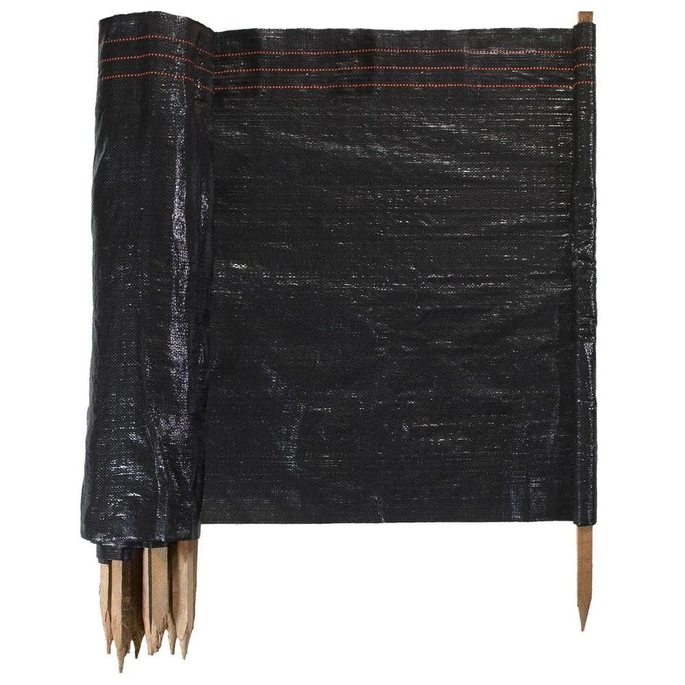 The 3 ft. x 100 ft. Silt Fence is a temporary or construction fence made from plastic. It is designed to help with erosion control. The black fence comes with wood posts for easier installation. The 3 ft. high fence can be used for commercial or residential applications.