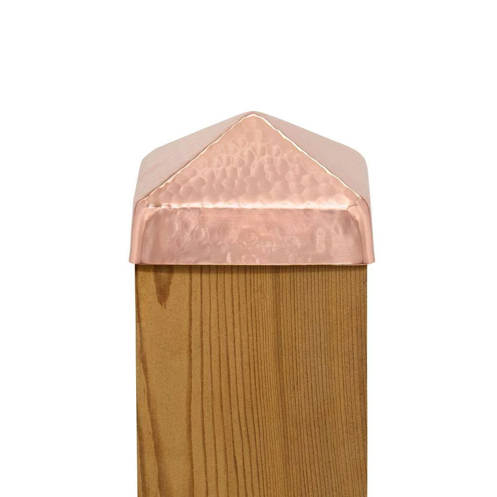 Give your fence the protection it deserves with 4 in. x 4 in. Slip Over Hammered 100% Copper Post Caps. Fitting atop 4 in. x 4 in. fence posts measuring 3-1/2 in., the stylish hammered copper pyramid prolongs the life of any fence post by guarding against rain and the elements. Protectyte copper post caps have a 3/4 in. lip with mounting holes for the included matching screws. The 1-piece hammered design gives you a finished look from all angles. Being these are 100% copper they will patina to a green color over time. If you want them to stay shiny, coat them with a clear lacquer metal outdoor spray.