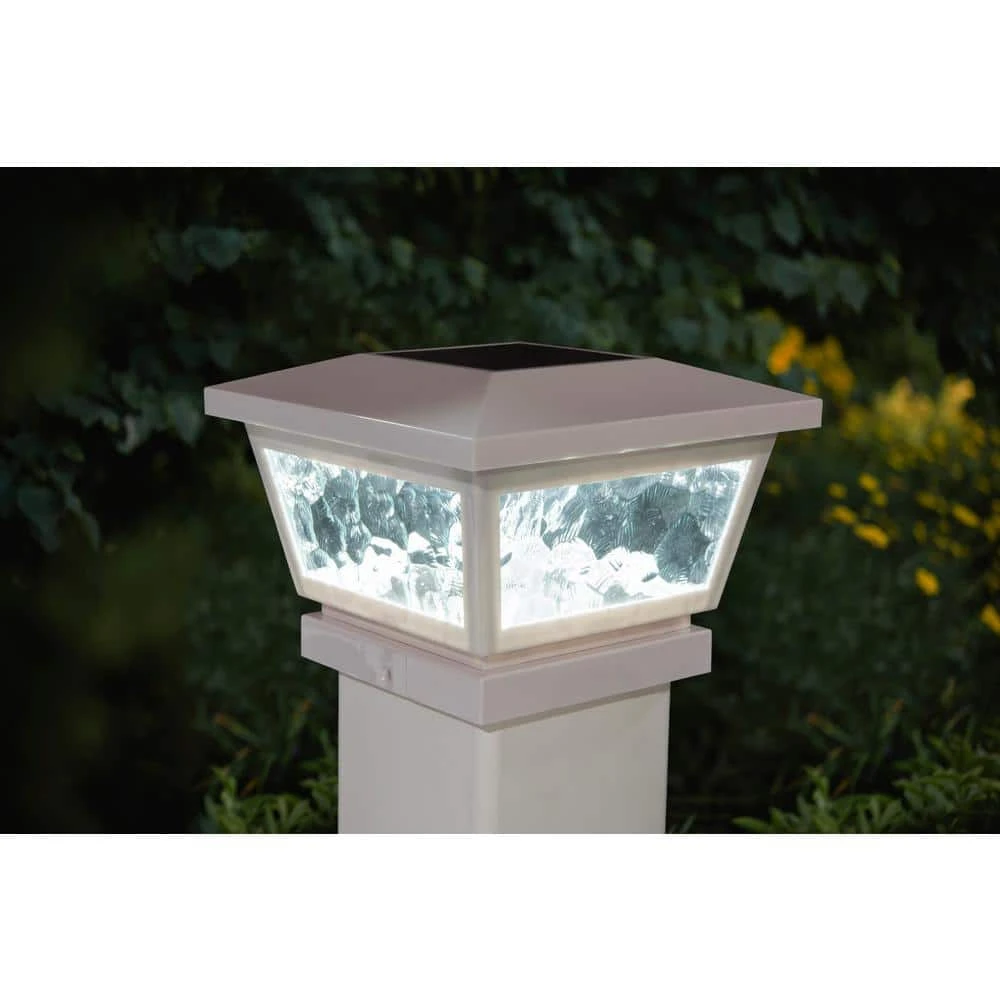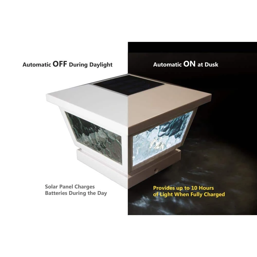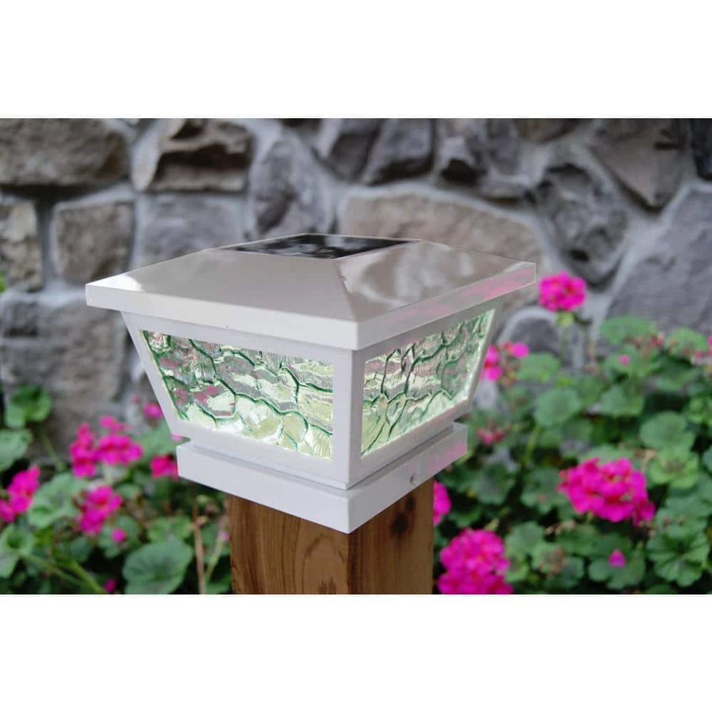The novel all weather versatile White Fairmont Solar Post Cap can be used for post or wall mount with easy installation. It is complimented using real pebbled glass and two high output LED’s that will cast a brilliant white light. Will fit over 3 post sizes – 5×5, 4×4 or 3.5×3.5 in. post. (Wall adaptor included).