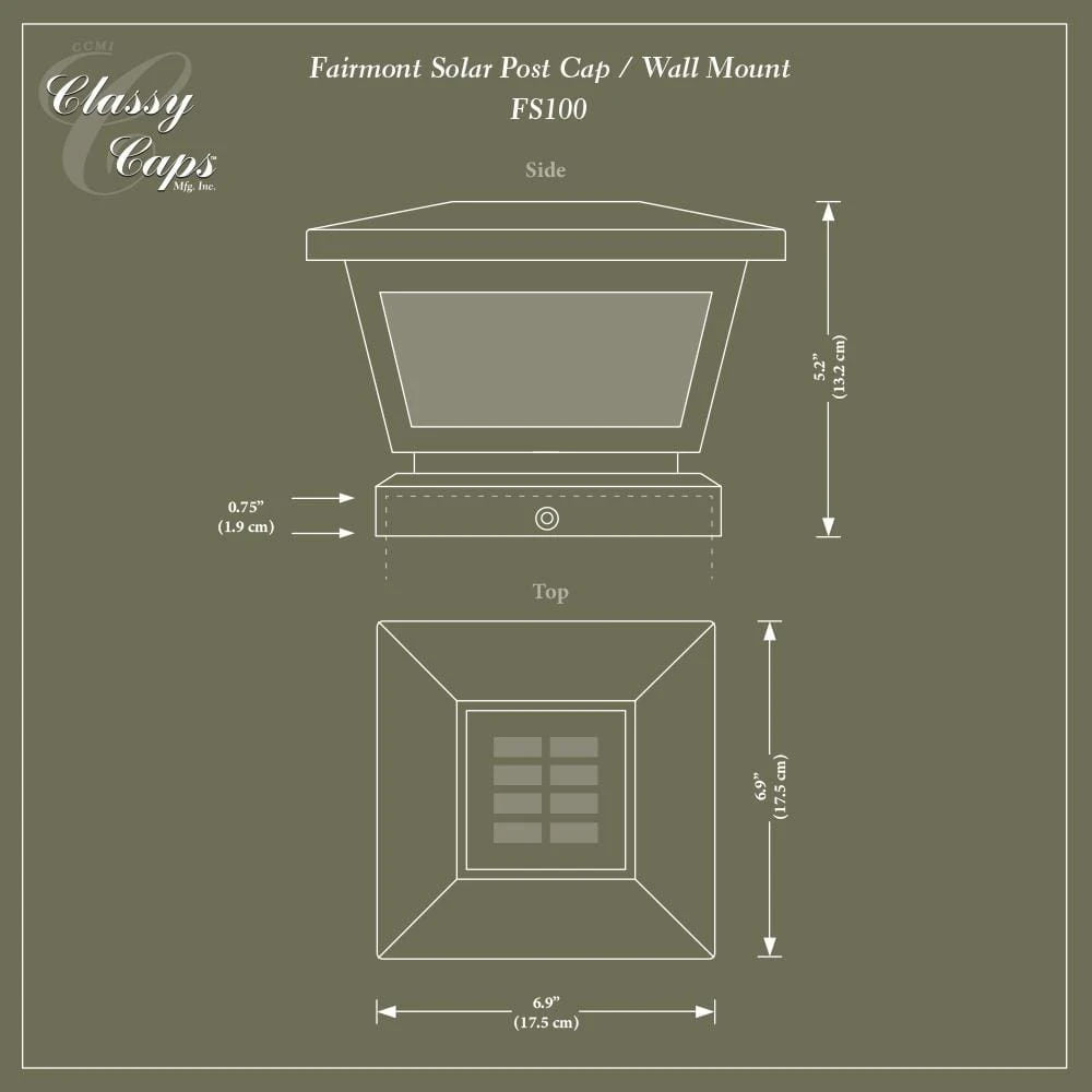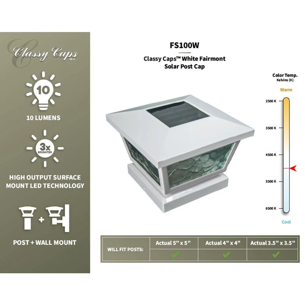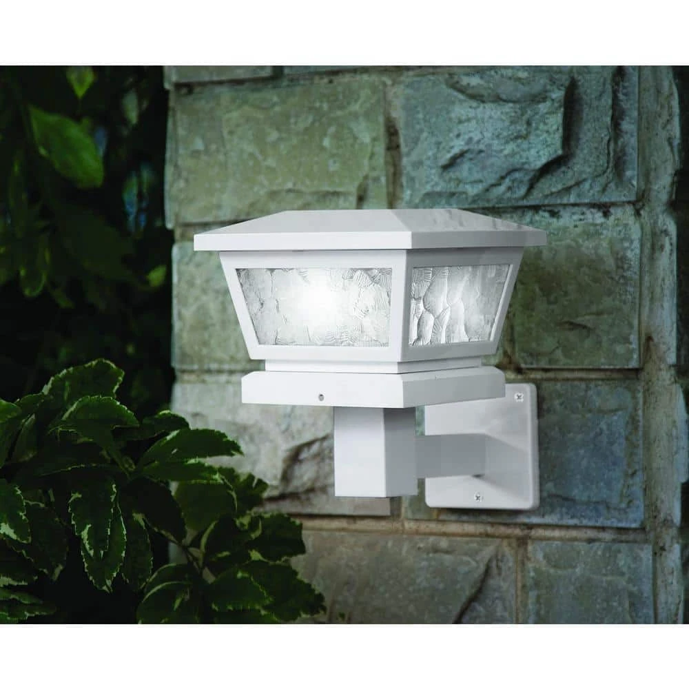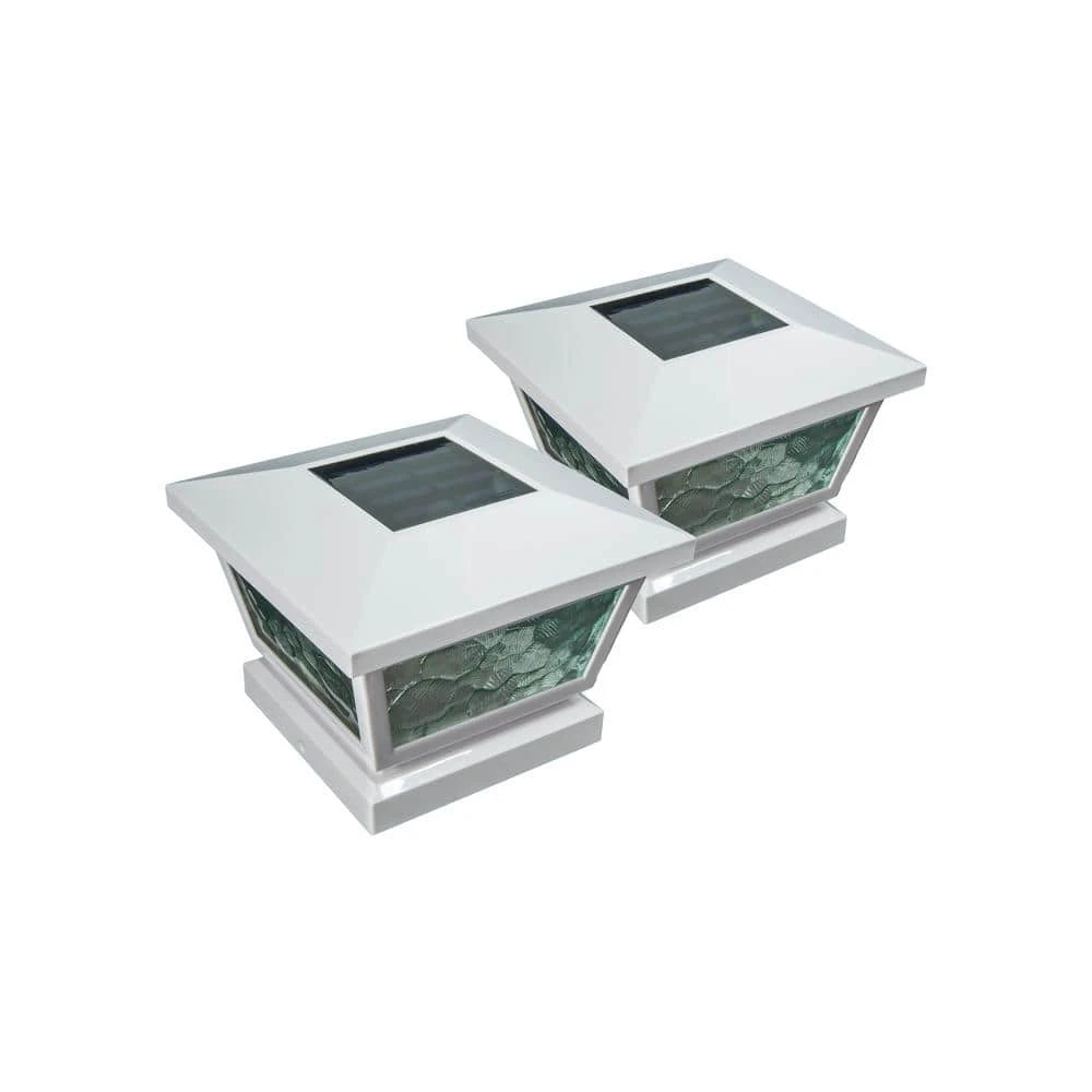The novel all weather versatile White Fairmont Solar Post Cap can be used for post or wall mount with easy installation. It is complimented using real pebbled glass and two high output LED’s that will cast a brilliant white light. Will fit over 3 post sizes – 5×5, 4×4 or 3.5×3.5 in. post. (Wall adaptor included).