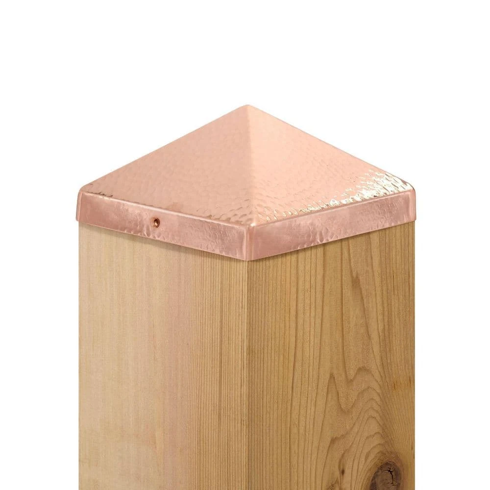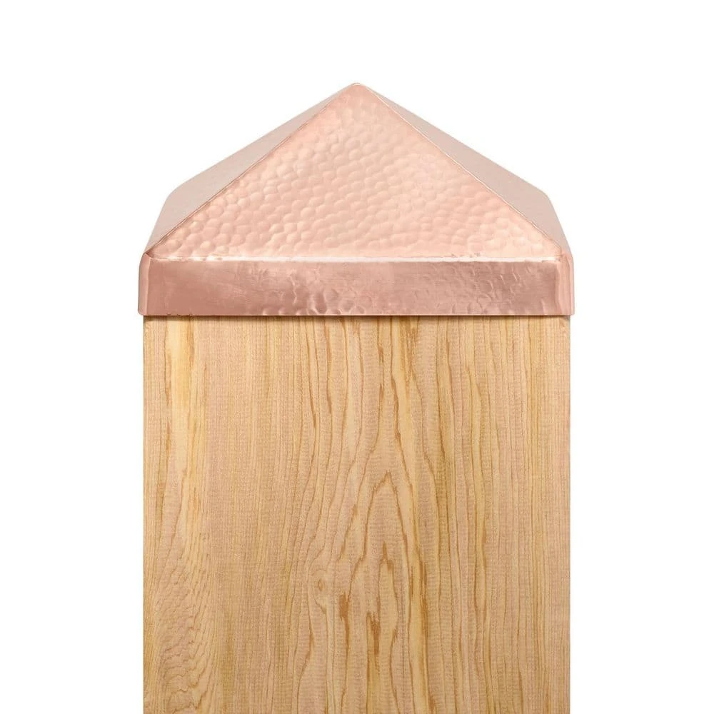 Give your fence the protection it deserves with 8 in. x 8 in. Slip Over Hammered 100% Copper Post Caps. Fitting atop 8 in. x 8 in. fence posts measuring 7-1/2 in., the stylish hammered copper pyramid prolongs the life of any fence post by guarding against rain and the elements. Protectyte copper post caps have a 3/4 in. lip with mounting holes for the included matching screws. The 1-piece hammered design gives you a finished look from all angles. Being these are 100% copper they will patina to a green color over time. If you want them to stay shiny, coat them with a clear lacquer metal outdoor spray.