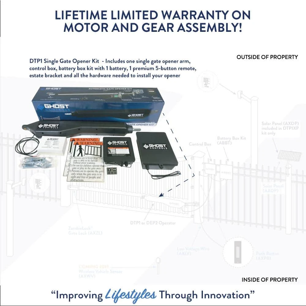 - Includes one AXP1 premium remote transmitter, control box with single system controller, battery box with one 12-Volt 7.0 Ah sealed gel battery and harness, estate gate bracket, installation/owner’s manual and all required mounting hardware