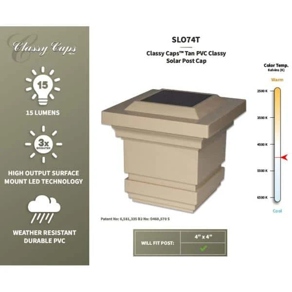 The Attractive traditional patented design of the original Classy Solar Post Cap will add radiance and allure to your fence or deck. Fabricated using four high output surface mount LED’s that will cast a brilliant white light downward onto the outside walls of the post cap and surrounding area, creating a unique ambience. Engineered to provide up to 12 hours of light automatically every night. Will fit over an actual 4″ x4″ post.