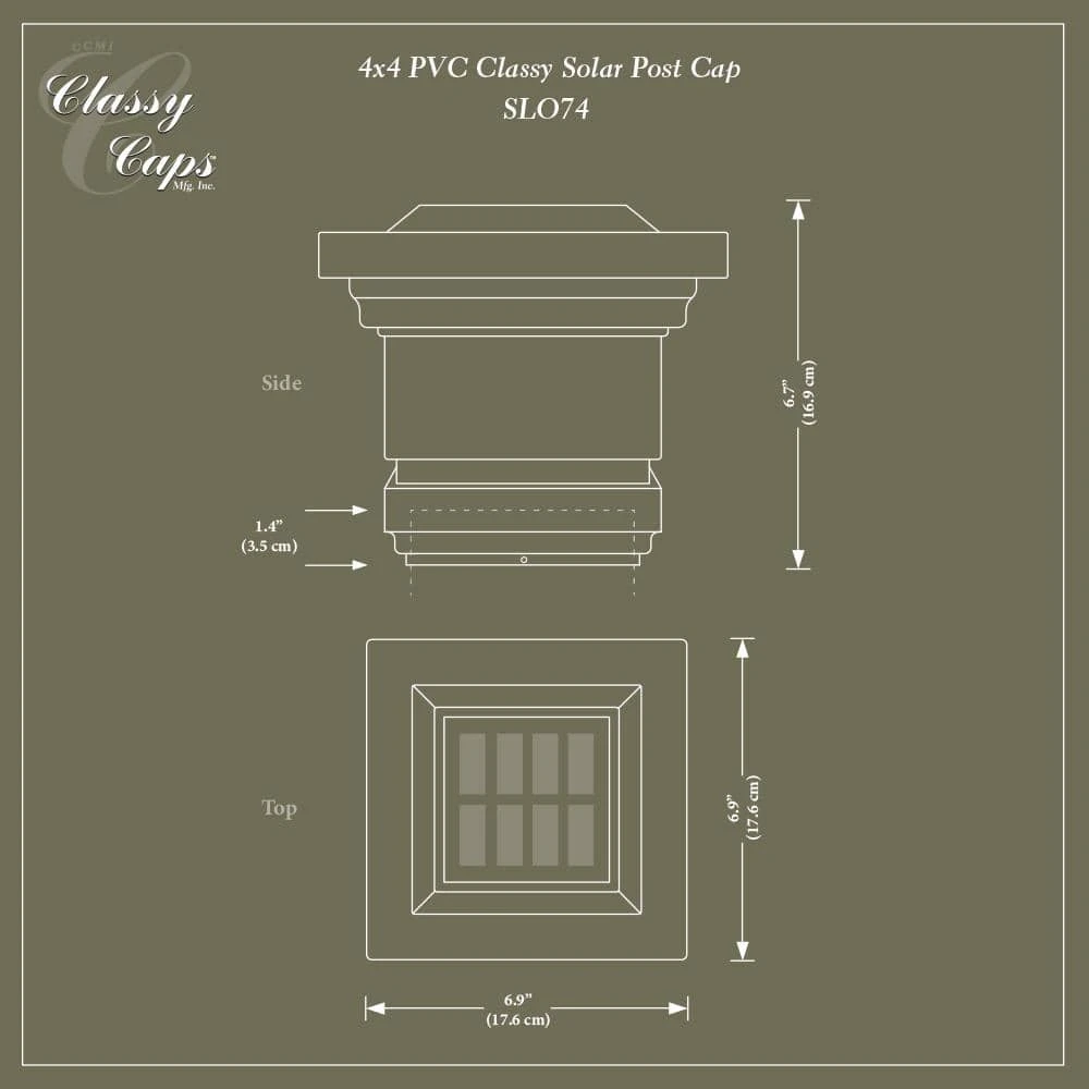 The Attractive traditional patented design of the original Classy Solar Post Cap will add radiance and allure to your fence or deck. Fabricated using four high output surface mount LED’s that will cast a brilliant white light downward onto the outside walls of the post cap and surrounding area, creating a unique ambience. Engineered to provide up to 12 hours of light automatically every night. Will fit over an actual 4″ x4″ post.