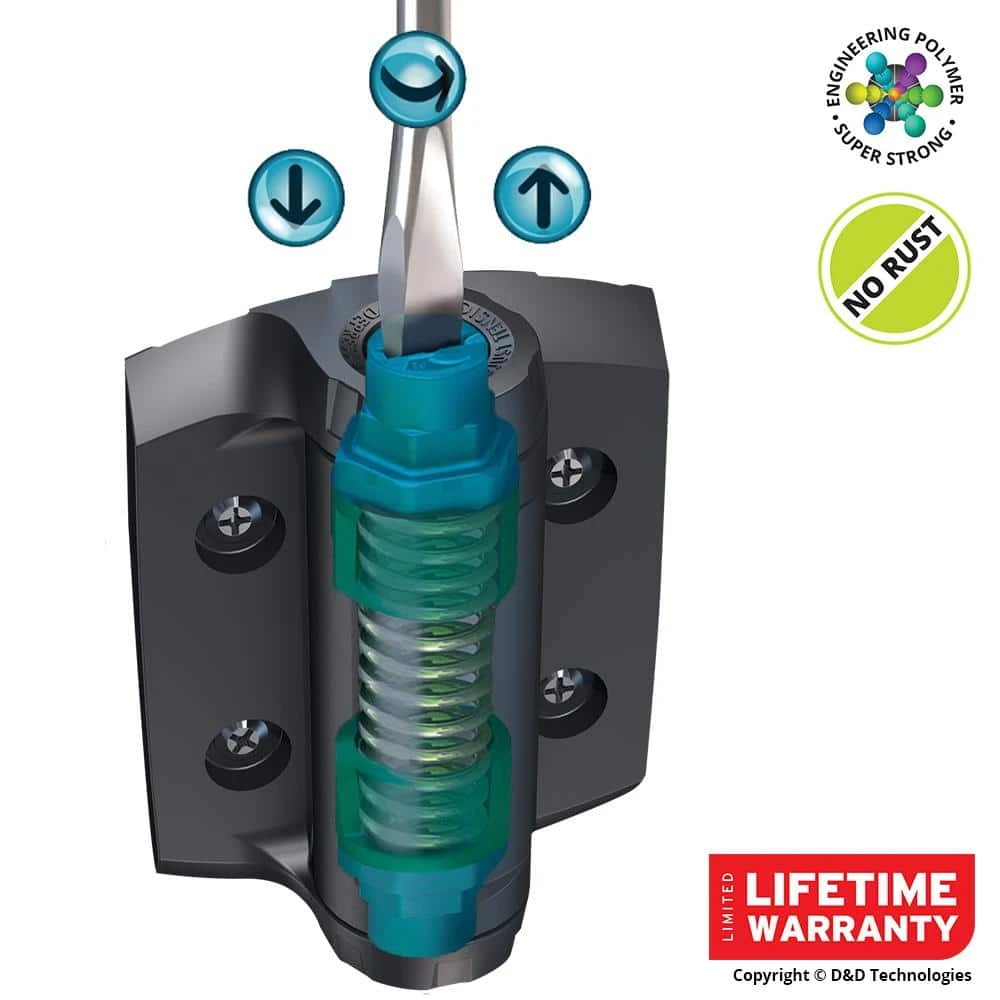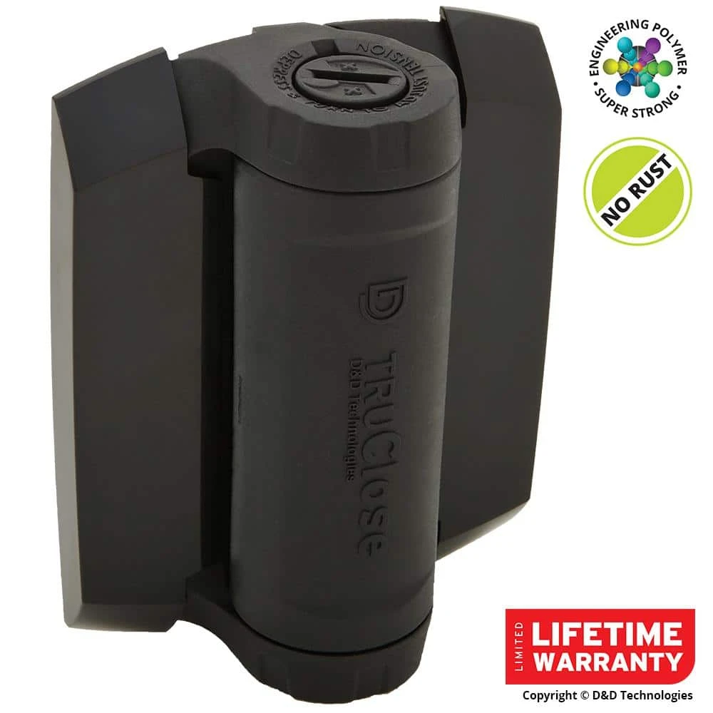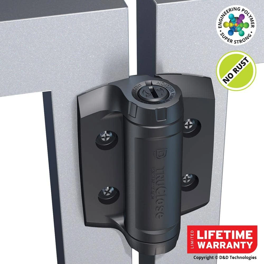 Tru-Close Heavy-Duty Standard hinges for metal gates deliver dependable Tru-Close reliability for pool safety and general-purpose gates around homes and yards, as well as high-traffic gates. These hinges are ideal for retrofitting existing gates as they will fit in gate gaps ranging from 1/4 in. 1 in. (6 mm to 25 mm). For heavy duty range square frame gates weighing up to 154 lbs./70 kg. Works best with ornamental aluminum or steel gate and fence materials in high use areas.