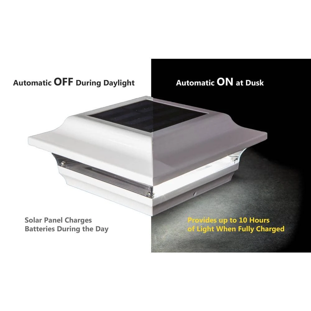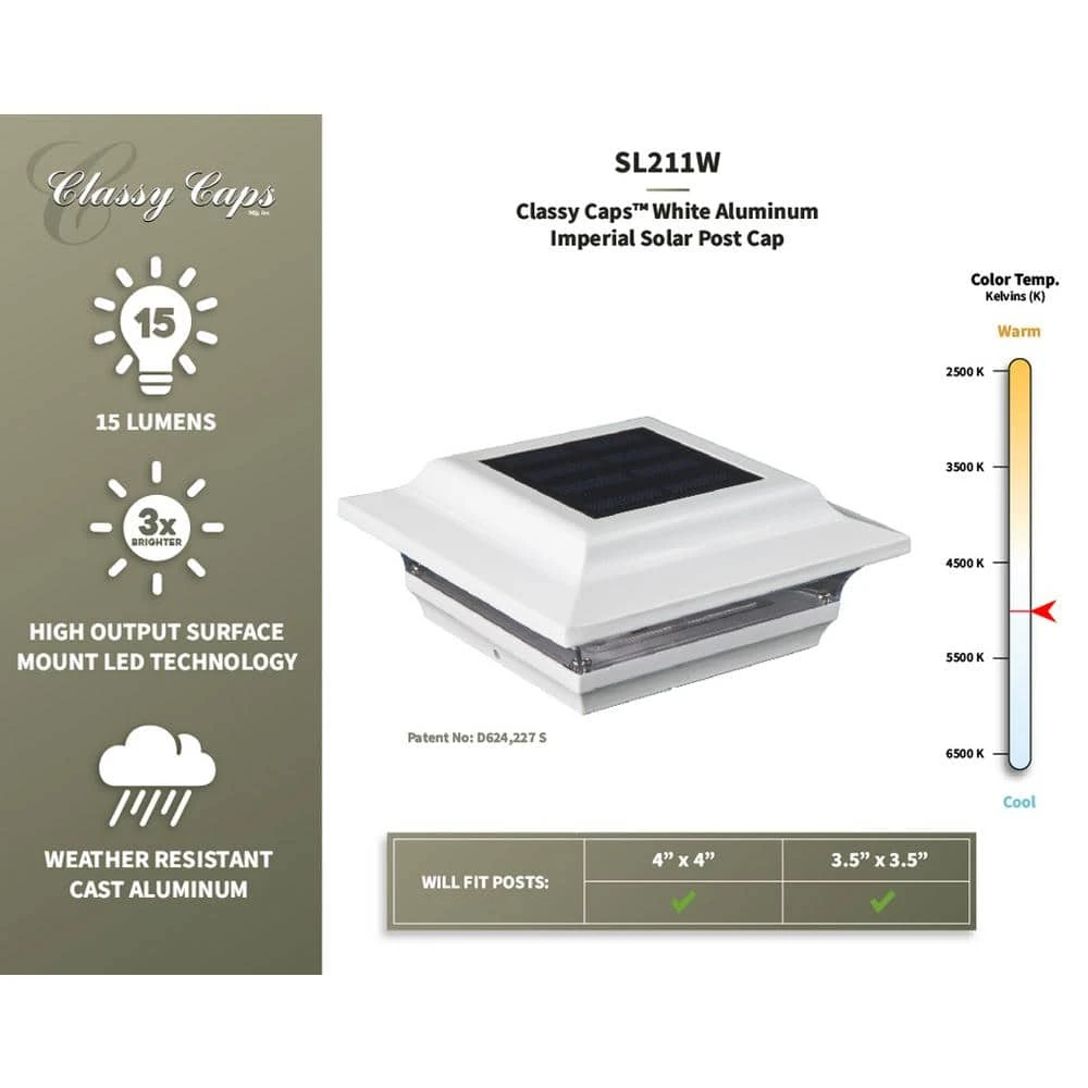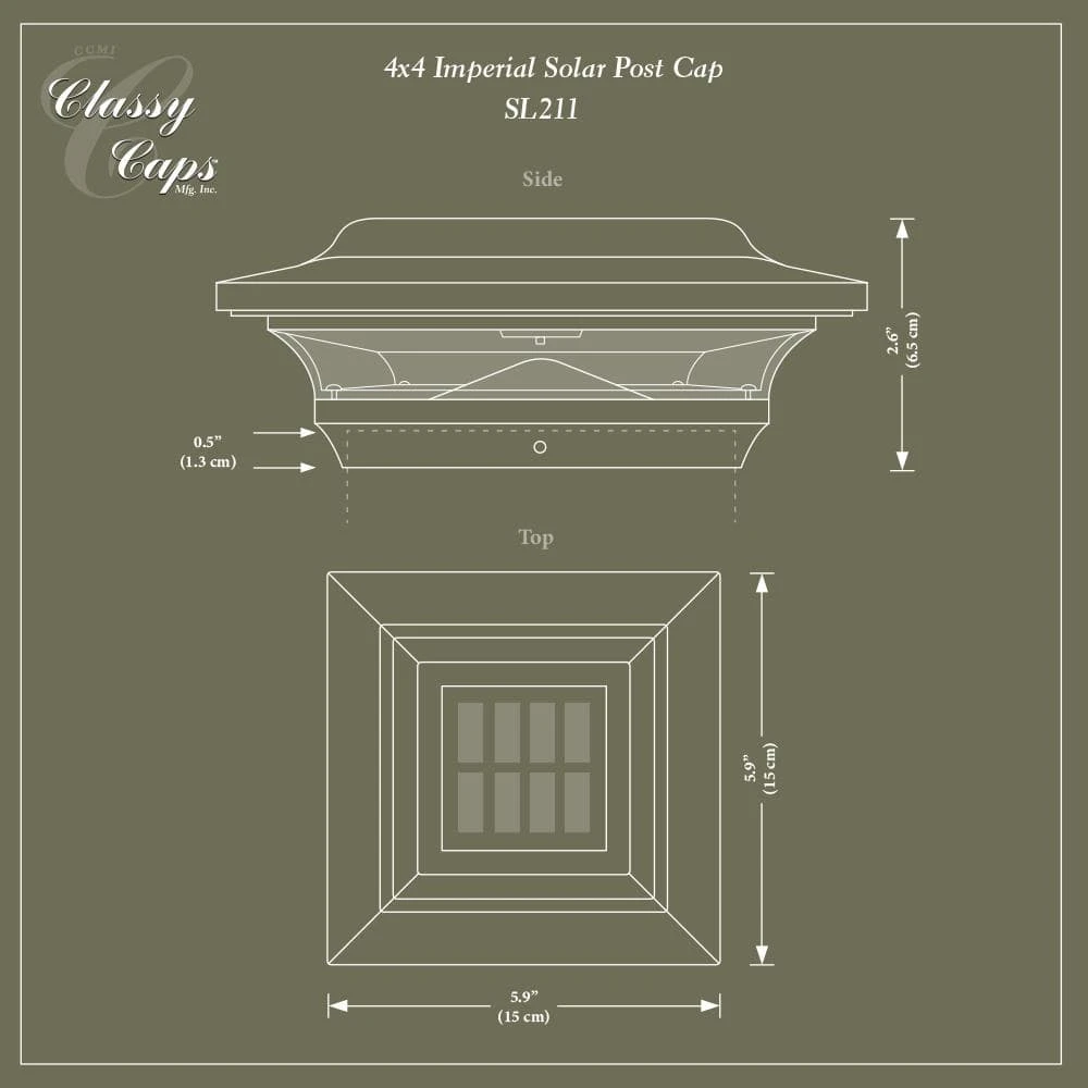 The modern yet elegant Imperial Solar Post Cap offers a clean contemporary design that is unequalled in performance. It’s rugged cast aluminum construction with powder coated finish means no future painting. The Imperial will fit over an actual 4″x4″ or 3.5″x3.5″ post (3.5″x3.5″ adaptor included)