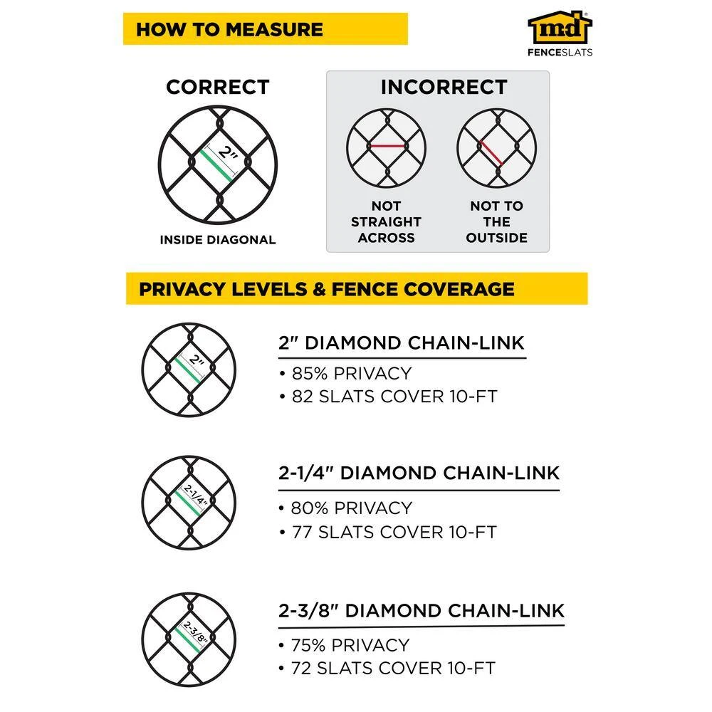 - Fence Slats provide 85% privacy in 2 in. diamond chain link, 80% privacy in 2-1/4 in. diamond chain link, and 75% privacy in 2-3/8 in. diamond chain link