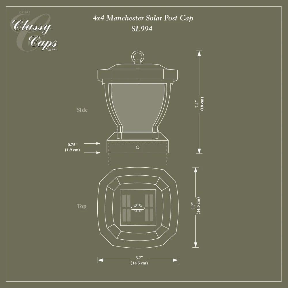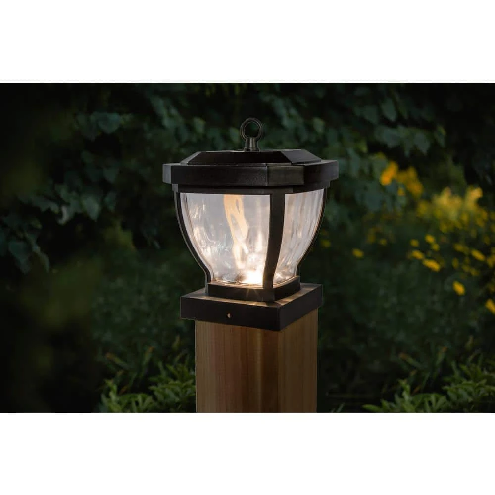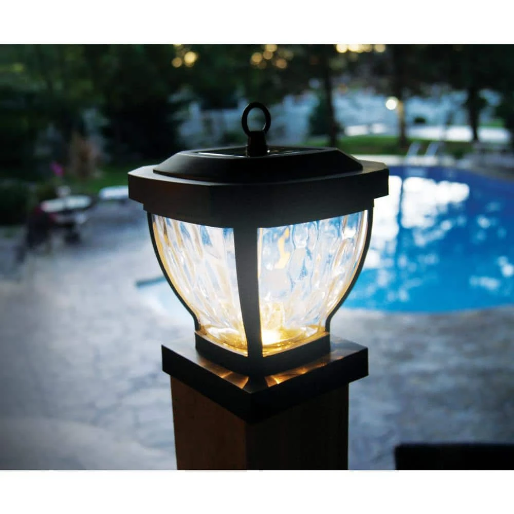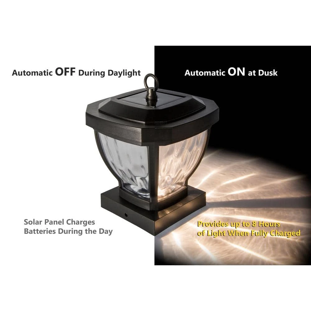 The stylish 4 in. x 4 in. Manchester solar post cap is manufactured using real water glass. It will cast a warm, elegant array of light onto the post and surrounding area. This crafty design can be used not only for a post, but it can also be hung on a hook or placed on a table. Will fit over an actual 3.5 in. x 3.5 in. post (post hook not included).