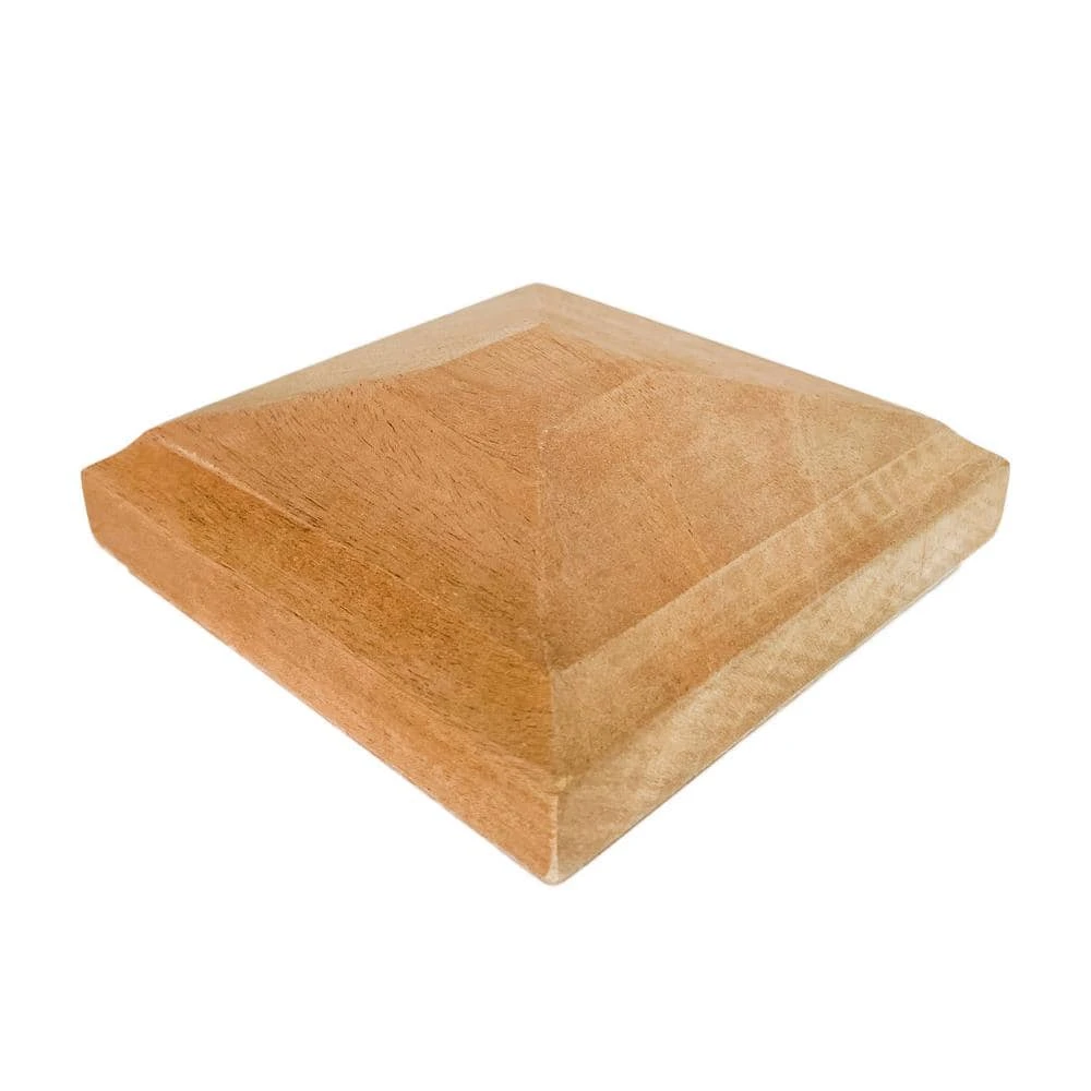 Give your fence the protection it deserves with 4 in. X 4 in. Slip over miterless wood post caps. Fitting atop 4×4 fence posts measuring 3-3/4 in. To 3-7/8 in., the stylish Mahogany base prolongs the life of any fence post by guarding against rain and the elements. Topped with a hard wood pyramid shape, the one piece joint less design features a traditional style trim and no staples or glue. The advantage of miterless post caps, versus others with joints at the corners, is evident in the prolonged life of your deck and fence posts. Less water gets underneath the cap and into the top of your post making our miterless products a necessity for any deck or fence. The one-piece cap is ready for weather treating to maximize protection, or controlled exposure for rustic appeal. Most effective when mounted with glue, the 4×4 wooden post cap installs easily and adds style to your yard while helping your fence last a lifetime.