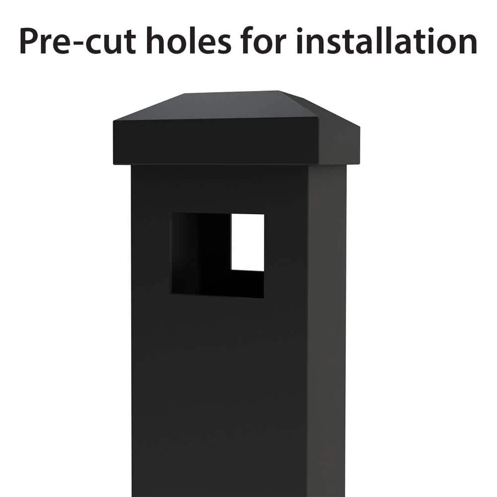 6 ft. line post features pre-drilled holes on both sides of post to connect fence panels in a straight line. The post features a powder-coated finish to help prevent rusting, provide longer lasting life and low maintenance. The post includes (1) flat post cap and hardware needed for installation. This 6 ft. line post is compatible with the 4 ft. H Newtown aluminum fence panels. Refer to the Newtown fence line for corresponding panel, gates, and accessories.