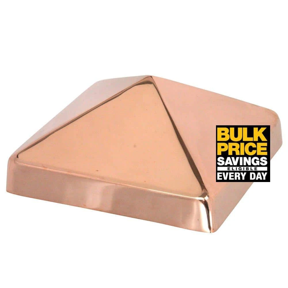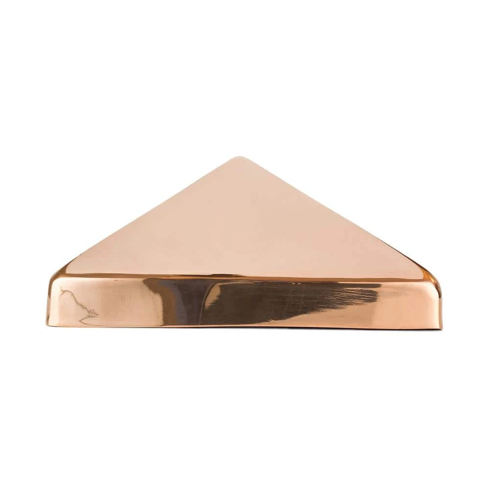 Give your fence the protection it deserves with 8 in. x 8 in. Slip Over Copper Post Caps. Fitting atop 8×8 fence posts measuring 7-1/2 in., the stylish copper pyramid prolongs the life of any fence post by guarding against rain and the elements. Our copper post caps have a 3/4 in. lip with mounting holes. The 1-piece stamped design gives you a finished look from all angles. Since these are 100% copper they will patina to a green color over time. If you want them to stay shiny then coat them with a clear lacquer metal, outdoor spray. All 8×8 copper post caps come with 2 screws for mounting.