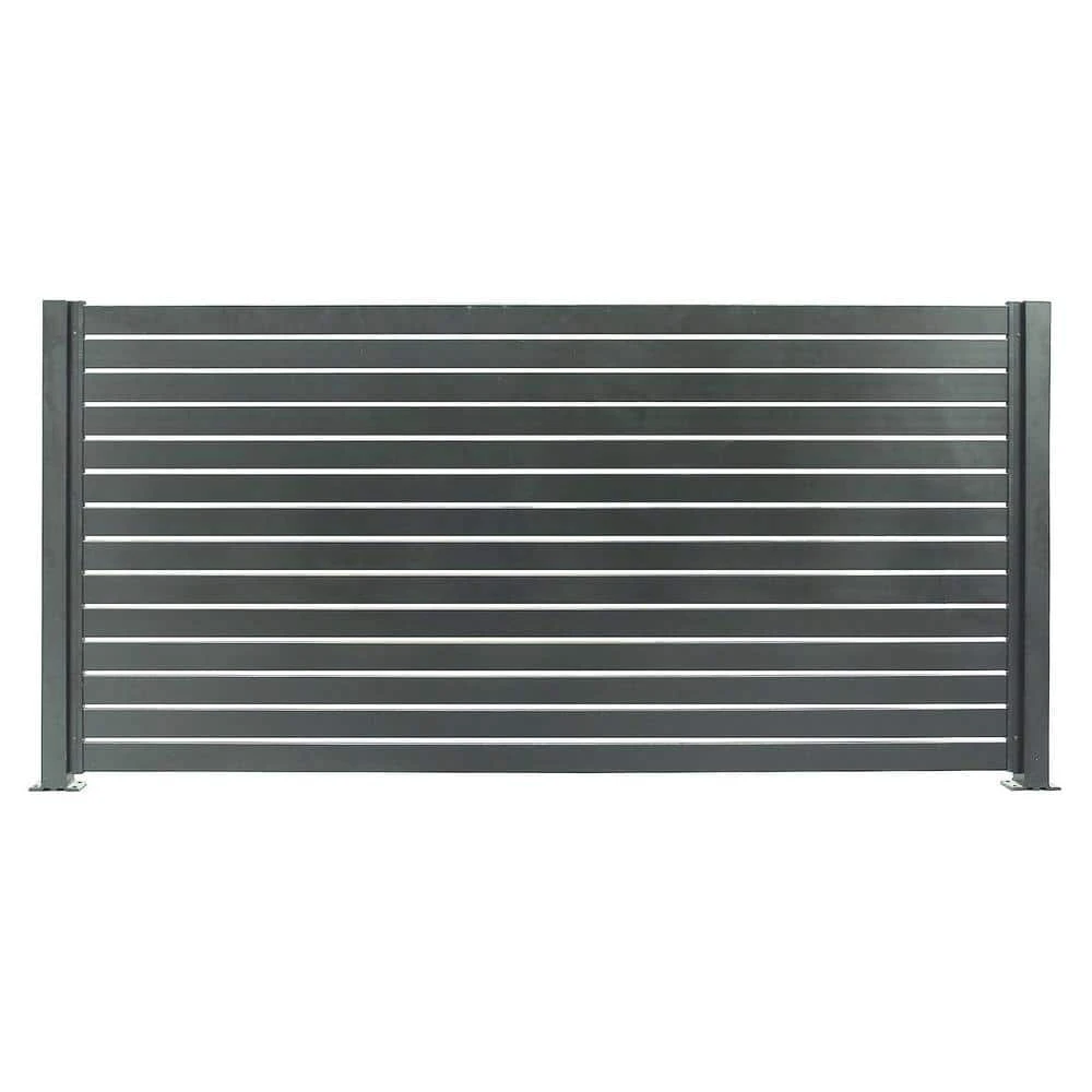 Create a perfect backyard oasis with the Aluminum Quick Screen Horizontal Slat fencing. This product has versatile uses including fencing, screening, and decorative. The fence is 100% aluminum and low maintenance. The material can be cut to your desired size. The Easy to Install fence will not rot, twist, or suffer termite damage. Size (94 in. W x 71 in. H x 2.5 in.) The aluminum is powder coated and available in white, black, beige and slate gray. The panel kit comes with 1 fence panel which consists of aluminum slats, Mid-rail, caps, spacer blocks, and screws. Base plates, side frames, 1-way post, 2-way posts, and the gate is sold separately. It is very important that you view install videos, FAQ, and the slat fence quick screen guide. This is a completely customizable fence system so all components are sold separately.