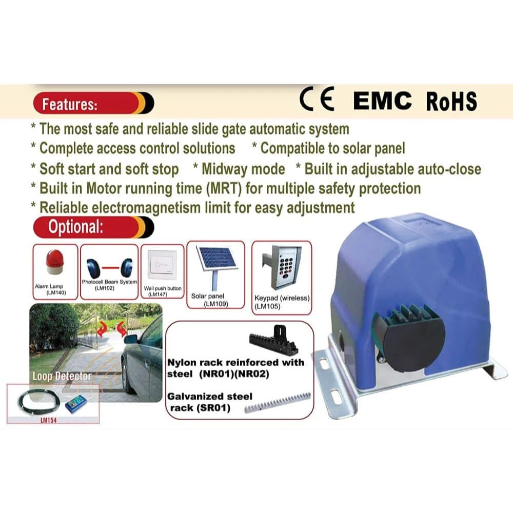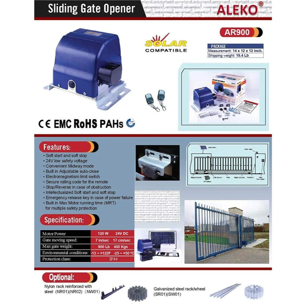 Designed with a 120-Volt AC (1/2 HP equivalent) motor, this gear rack driven sliding gate opener provides exceptional starting torque and continuous operation, making it ideal for most applications. Constructed with an aluminum alloy chassis, it’s corrosion resistant and light enough for one person to carry and install. Opens gates up to 900 lbs. and up to 30 ft. in length. 13 ft. gear rack tracks is included (4 pieces Gear Racks, 3.3 ft. each, total: 13 ft.); if your gates more 13 ft. in length just purchase an extra racks.