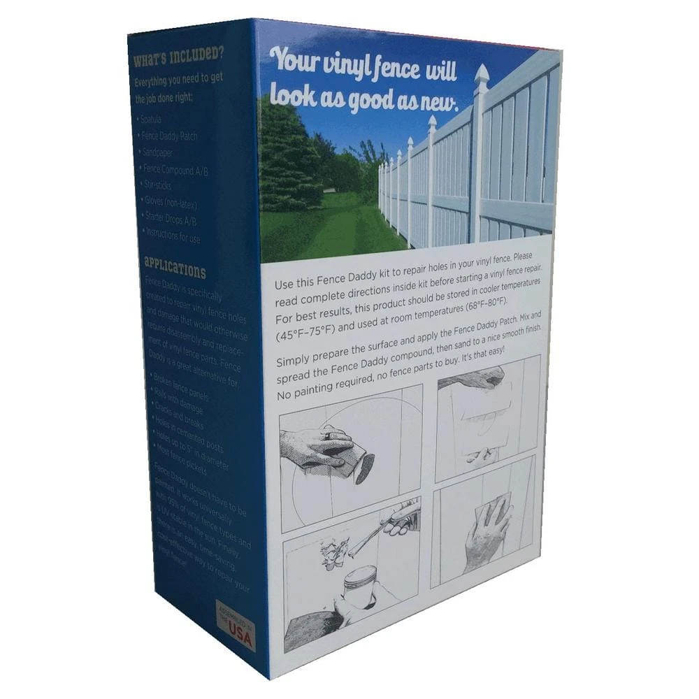 - What’s included: instructions for use, (2-pairs) 4 -nitrile gloves, two 4 oz. jars of color matched fence daddy compound, 2 vials of fence daddy starter, 120 grit wet/dry sand paper, plastic smoothing spatula, 2 medical grade stir sticks, 7 in. x 11 in. white fence daddy patch, everything needed to get the job done